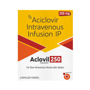 Aclovil 250mg Injection is an antiviral medicine effective against herpes simplex and varicella zoster viruses. It does not cure infections caused by these viruses but helps to minimize the symptoms and shorten the duration of infection. It does not remove the viruses from the body but prevents the viruses from dividing and spreading.