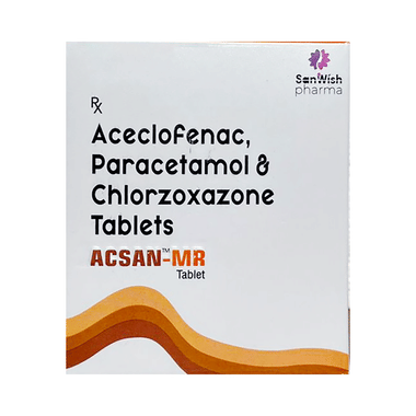 Acsan-MR Tablet is a combination of three medicines: Aceclofenac, Paracetamol and Chlorzoxazone. This medicine helps in relieving muscle pain by relaxing the affected muscles. It relieves pain caused due to muscle spasm, cramp or injury. It also lowers certain chemical substances in the body that cause pain.