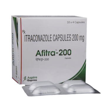 Afitra 200 Capsule is used to treat fungal infections caused by Trichophyton spp., Microsporum spp., and Epidermophyton floccosum. The infections caused could be ringworm infection, infection of feet, or infection in groin and buttocks. This medicine also treats persistent infection of fingernails and toenails, persistent candida (yeast) infections of vagina or candida (yeast) infections of the mouth or throat in patients with lower resistance to disease. It is also used in the treatment of cryptococcal infection and infections caused by histoplasma, aspergillus and blastomyces.