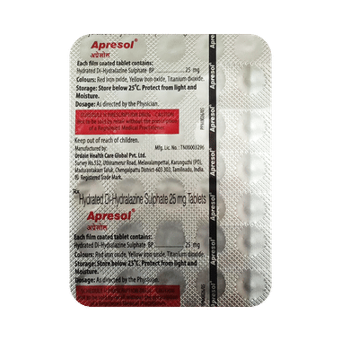 ApREsol Tablet belongs to a class of drugs known as vasodilators and is used for the treatment of hypertension (high blood pressure). It may also be used in combination with other medicines in the treatment of heart failure.