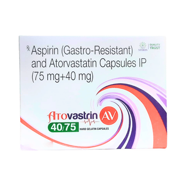 Atovastrin AV 40/75 Capsule is a combination of two medicines used to prevent heart attack and stroke. It lowers the "bad" cholesterol (LDL) and triglycerides and raises the "good" cholesterol (HDL) levels in the body. Moreover, it also decreases the formation of blood clots.