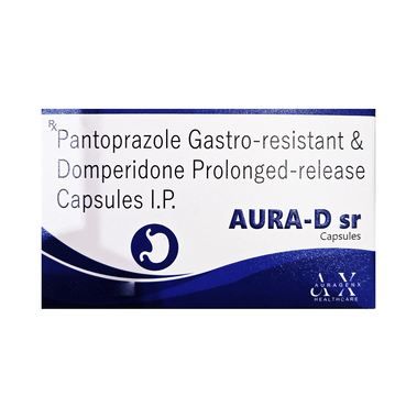 Aura-D sr Capsule is a medicine that is used to treat conditions like acid reflux disease (GERD), erosive esophagitis, gastritis, gastric and duodenal ulcers, and indigestion with symptoms like heartburn, bloating, and regurgitation. It works by lowering acid production and helping the stomach empty faster.