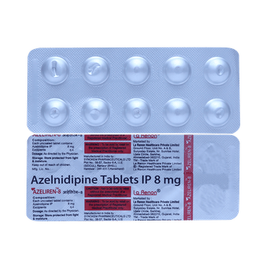 Azeliren 8mg Tablet is a medicine used to treat high blood pressure. It belongs to a group of medicines that block the calcium channels in the blood vessel. It works by relaxing the blood vessels in patients with high blood pressure. This widens the diameter of the blood vessels which helps the blood to pass through them more easily.