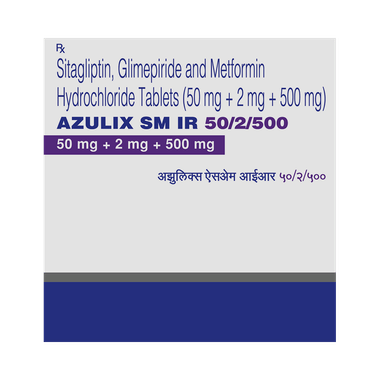Azulix SM IR 50/2/500 Tablet is a combination of three medicines used to lower blood glucose levels in people with type 2 diabetes mellitus. It is generally prescribed when diet, exercise, and other treatments do not result in adequate glycemic control.Azulix SM IR 50/2/500 Tablet is best taken with food; however, take this medicine regularly and at the same time each day to get maximum benefits. The dose and duration are decided according to your condition and how well you respond to it. The doctor may also monitor your blood sugar levels regularly when you are taking this combination medicine.