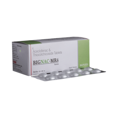 Bignac-MR 4 Tablet is a combination of two medicines: Aceclofenac and Thiocolchicoside. This medication helps in relieving muscle pain. It relaxes the muscles by acting on the central nervous system and lowering chemical substance in the body that cause pain and inflammation.