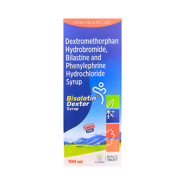 Bisalatin Dexter Syrup Sugar Free is a combination medicine used to treat cold symptoms and cough. It suppresses cough, helping to reduce the urge to cough by affecting the signals in the brain. It also relieves allergy symptoms like watery eyes, sneezing, runny nose, and throat irritation associated with the common cold.Bisalatin Dexter Syrup Sugar Free may be taken with or without food. Take it in the dose and duration as provided by your doctor or as indicated on the packaging. The dose and duration of the treatment will depend on the patient's age and condition. Take it at regular intervals for maximum benefits. Do not take more than prescribed, as it could lead to harmful side effects.