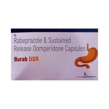 Burab DSR Capsule is a combination of two medicines: Domperidone and Rabeprazole. This combination is used to treat acidity and heartburn or gastroesophageal reflux disease (GERD); a condition where the acid in the stomach flows back up into the food pipe (esophagus). It is also used to treat gastric and duodenal ulcers. Domperidone helps to control vomiting by increasing the movement of the gut, allowing the food to move more easily through the stomach.