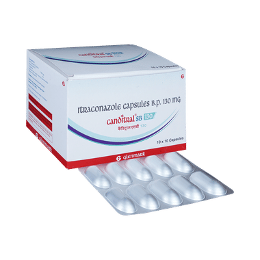 Canditral SB 130 Capsule is used to treat fungal infections caused by Trichophyton spp., Microsporum spp., and Epidermophyton floccosum. The infections caused could be ringworm infection, infection of feet, or infection in groin and buttocks. This medicine also treats persistent infection of fingernails and toenails, persistent candida (yeast) infections of vagina or candida (yeast) infections of the mouth or throat in patients with lower resistance to disease. It is also used in the treatment of cryptococcal infection and infections caused by histoplasma, aspergillus and blastomyces.