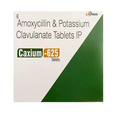 Caxium 625 Tablet is a combination of two medicines (amoxycillin and clavulanic acid) used to treat bacterial infections, such as tonsillitis, sinusitis, otitis media, respiratory tract infections, urinary tract infections, boils, abscesses, cellulitis, wound infection, bone infection, and oral cavity infections. The medicine works by killing the harmful bacteria that cause infections.