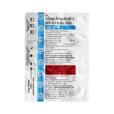 Cefi XL + Tablet IR is a combination medicine. It is prescribed to treat various types of bacterial infections. It fights against the infection to prevent the growth and further spread of the microorganisms. It also prevents diarrhea which may occur as a side effect of this medicine.