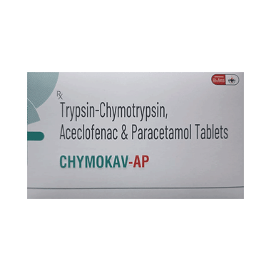 Chymokav-AP Tablet is a combination of four medicines: Aceclofenac, Paracetamol, Trypsin and Chymotrypsin. This medicine helps in decreasing pain and swelling. It lowers the levels of chemical substances in the body that causes pain and swelling.