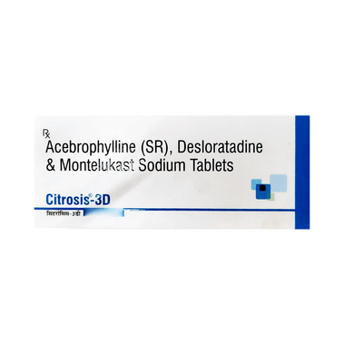 Citrosis 3D Tablet SR is a combination medicine used in the prevention of asthma. It relieves allergy symptoms such as runny nose, stuffy nose, sneezing, watery eyes, and congestion or stuffiness. It also helps relax the air passages' muscles, thus widening it and making it easier to breathe.Citrosis 3D Tablet SR is taken with or without food in a dose and duration as the doctor advises. Your dose will depend on your condition and how you respond to the medicine. You should keep taking this medicine for as long as your doctor recommends. If you stop treatment too early, your symptoms may come back, and your condition may worsen. Let your healthcare team know about all other medications you are taking, as some may affect or be affected by this medicine.