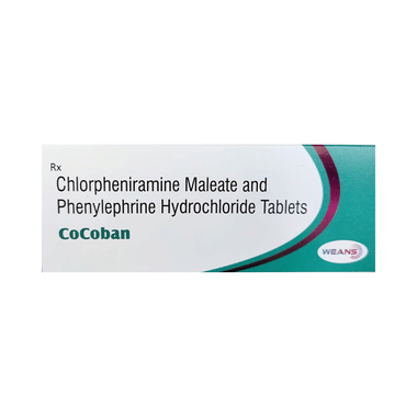 Cocoban Tablet is a combination of two medicines that help to relieve the symptoms of cold. It consists of Chlorpheniramine, an antiallergic that relieves allergy symptoms like runny nose, watery eyes, and sneezing. It also consists of Phenylephrine, a decongestant that narrows the small blood vessels providing relief from congestion or stuffiness in the nose.