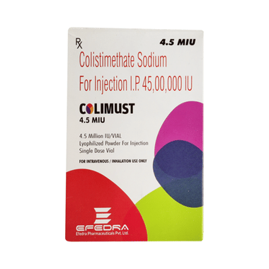 Colimust 4.5 MIU Injection is an antibiotic that fights bacteria. It is used to treat severe bacterial infections of the body. It is commonly used for critically ill patients admitted to the hospital.