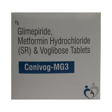 Conivog-MG3 Tablet SR is a combination of medicines used in the treatment of type 2 diabetes mellitus (DM). It improves the blood glucose levels in adults when taken along with a proper diet and regular exercise. Glimepiride lowers the blood glucose levels by increasing the release of insulin from the pancreas. Metformin works by lowering glucose production in the liver and improving insulin sensitivity. Voglibose is an alpha-glucosidase inhibitor that lowers the postprandial (after meals) glucose levels in the body. This combination is not indicated for the treatment of type 1 DM.