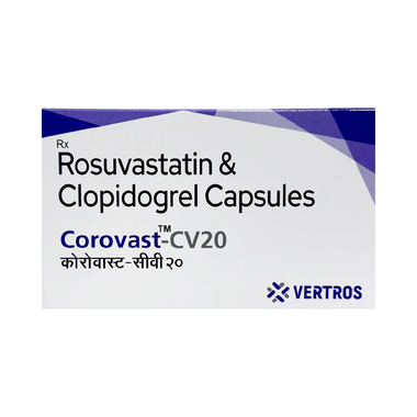 Corovast-CV20 Capsule is a combination of two medicines used to prevent heart attack and stroke. This medicine reduces the "bad" cholesterol (LDL) and triglycerides (fats) levels. Moreover, it also decreases the formation of harmful blood clots. This medicine should be taken with food to avoid stomach upset. Lifestyle changes like low-fat diet, exercise, and not smoking may help this medicine to work better. It may change liver function and blood sugar levels, so monitor them properly. This medicine increases your risk of bleeding, so it is important to be careful while shaving, cutting nails, using sharp objects, or engaging in contact sports (e.g. football, wrestling). Stomach pain and constipation are some other common side effects associated with this medicine.
