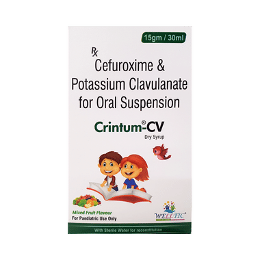 Crintum-CV Dry Syrup Mix Fruit is a potent antibiotic that effectively treats bacterial infections of the ear, nose, throat, lungs, skin, soft tissues, bones, joints, abdomen, and urinary tract in children. It also prevents infection after surgeries and animal or human bite wounds.Crintum-CV Dry Syrup Mix Fruit can be given either before or after meals but giving it with food improves absorption and reduces the chances of stomach upset in your child. The dose and duration depend upon the type and severity of the infection, so stick to the dose, time, and way prescribed by the doctor. If your child vomits within 30 minutes of the intake, give the same dose again but do not double dose if it is already time for the next dose.