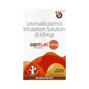 Critlin 0.63mg Respule (2.5 ml Each) is a belongs to a group of medicines called fast-acting bronchodilators or relievers. It is used to treat the symptoms of asthma and chronic obstructive pulmonary disease (COPD) such as coughing, wheezing, and feeling short of breath.