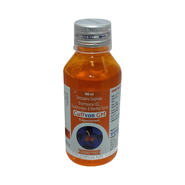 Cuffvon GM Expectorant Sugar Free is taken with or without food in a dose and duration as advised by the doctor. The dose you are given will depend on your condition and how you respond to the medicine. You should keep taking this medicine for as long as your doctor recommends. If you stop treatment too early your symptoms may come back and your condition may worsen. Let your doctor know about all other medications you are taking as some may affect, or be affected by this medicine.