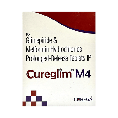 Cureglim M 4 Tablet PR is a combination of two medicines: glimepiride and metformin. This medicine is used in the treatment of type 2 diabetes mellitus (DM). It improves blood glucose levels in adults when taken along with a proper diet and regular exercise. Glimepiride lowers the blood glucose levels by increasing the release of insulin from the pancreas. Metformin works by lowering glucose production in the liver and improving insulin sensitivity. This combination is not indicated for the treatment of type 1 DM.
