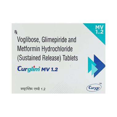 Curglim MV 1.2 Tablet SR is a combination of three medicines: Glimepiride, Metformin and Voglibose. This medicine is used in the treatment of type 2 diabetes mellitus (DM). It improves the blood glucose levels in adults when taken along with proper diet and regular exercise. Glimepiride lowers the blood glucose levels by increasing the release of insulin from the pancreas. Metformin works by lowering the glucose production in the liver and improving insulin sensitivity. Voglibose is an alpha-glucosidase inhibitor which lowers the postprandial (after meals) glucose levels in the body. This combination is not indicated for the treatment of Type 1 DM.