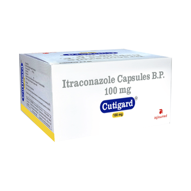 Cutigard 100mg Capsule is used to treat fungal infections caused by Trichophyton spp., Microsporum spp., and Epidermophyton floccosum. The infections caused could be ringworm infection, infection of feet, or infection in groin and buttocks. This medicine also treats persistent infection of fingernails and toenails, persistent candida (yeast) infections of vagina or candida (yeast) infections of the mouth or throat in patients with lower resistance to disease. It is also used in the treatment of cryptococcal infection and infections caused by histoplasma, aspergillus and blastomyces.