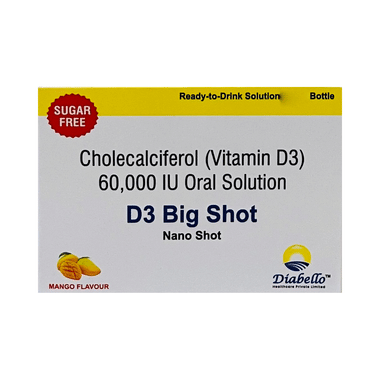 D3 Big Nano Shot (5ml Each) Mango Sugar Free is used in the treatment of vitamin D deficiency and osteoporosis. It helps the body to absorb calcium. Calcium is essential for maintaining strong and healthy bones. It is used when your diet does not provide enough calcium.D3 Big Nano Shot (5ml Each) Mango Sugar Free should be taken as directed by your doctor. It is best taken with or after food, as this helps your body absorb it, and you should take it regularly to get the most benefits. If you are using it to treat osteoporosis, you will also be prescribed other medicines. This medicine may be only part of a complete treatment program that includes making changes to your diet and taking calcium and vitamin supplements. Absorb about the foods you should eat to ensure you get enough calcium and vitamin D.
