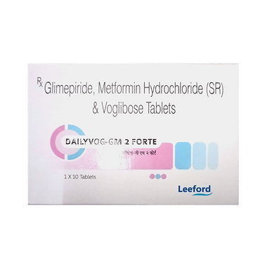 Dailyvog GM Forte 2mg/1000mg/0.2mg Tablet SR is a combination of medicines used in the treatment of type 2 diabetes mellitus (DM). It improves the blood glucose levels in adults when taken along with a proper diet and regular exercise. Glimepiride lowers the blood glucose levels by increasing the release of insulin from the pancreas. Metformin works by lowering glucose production in the liver and improving insulin sensitivity. Voglibose is an alpha-glucosidase inhibitor that lowers the postprandial (after meals) glucose levels in the body. This combination is not indicated for the treatment of type 1 DM.