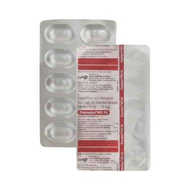 Dapaglyn MX 10mg/50mg Tablet may be taken with or without food. To increase the effectiveness of the medicine, take it regularly and in the exact dose and duration as prescribed by your doctor. Take it at the same time each day to maintain steady levels in your body. Keep a heart-healthy lifestyle, such as following a low-salt diet, staying physically active as advised by your doctor, managing stress, and quitting smoking.