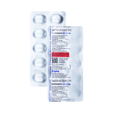Dapasach S 5mg/100mg Tablet can be taken with or without food at any time of day, but try to take it at the same time every day. The dose will be decided by your doctor, and don’t stop taking it without consulting them. If you do, your blood sugar levels may increase and put you at risk of serious complications like kidney damage and blindness. This medicine is only a part of the treatment program that should include a healthy diet, regular exercise, and weight reduction as advised by your doctor.