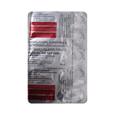 Dapavel GM Tablet ER is a combination of three medicines used to treat type 2 diabetes mellitus. It helps control the high blood sugar levels seen in diabetes. This reduces the chances of serious complications of diabetes and also helps prevent heart disease.Dapavel GM Tablet ER may be taken with or without food. Take it at the same time every day, this will help you remember to take it. The dose will be decided by your doctor. Do not stop taking it without asking your doctor. If you do, your blood sugar levels may increase and put you at risk of serious complications like kidney damage and blindness. This medicine is only part of a treatment program that should include a healthy diet, regular exercise, and weight reduction as advised by your doctor.