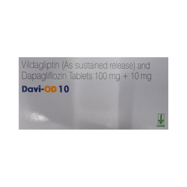 Davi OD 10mg/100mg Tablet SR is a combination medicine that helps control blood sugar levels. This medicine is used together with diet and exercise to improve blood sugar control in adults with type 2 diabetes mellitus. It helps in proper utilization of insulin, thereby lowering the blood sugar level.