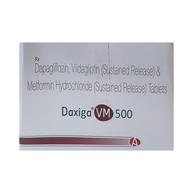 Daxiga VM 500 Tablet SR is a combination medicine that helps control blood sugar levels. This medicine is used together with diet and exercise to improve blood sugar control in adults with type 2 diabetes mellitus. It helps in the proper utilization of insulin, thereby lowering the blood sugar level.