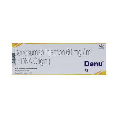 Denu Injection is a medicine used in the treatment of osteoporosis in postmenopausal women and in men at increased risk of fractures. It makes the bones strong and reduce the risk of fractures.