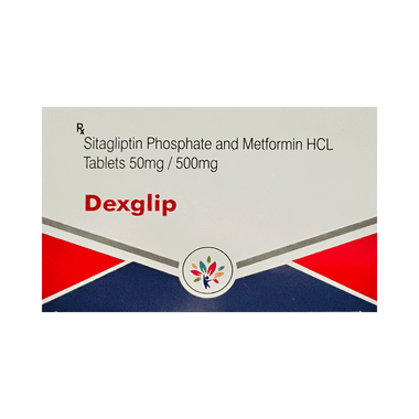 Dexglip 50/500 Tablet is a combination of two medicines: sitagliptin and metformin. This medicine is used in the treatment of type 2 diabetes mellitus. It improves blood glucose levels in adults when taken along with a proper diet and regular exercise. Metformin lowers glucose production in the liver and improves insulin sensitivity. Sitagliptin inhibits the enzyme DPP4 and increases insulin release from the pancreas. This combination is not indicated for patients below 18 years of age.
