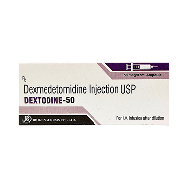 Dextodine 50 Injection is a prescription medicine used to provide sedation (a state of calm, drowsiness, or sleep) for adult patients in intensive care settings. It may also be used for awake sedation during diagnostic and surgical procedures.Dextodine 50 Injection is given as an infusion (drip) into a vein under the supervision of a healthcare professional. It is important to inform your doctor if you are suffering from any medical conditions like slow heart rate, low blood pressure, neurological disorder, severe liver problems, or have ever developed a serious fever after some medicines, especially after taking anesthesia. Your doctor will monitor the cardiac and respiratory state after providing this injection.
