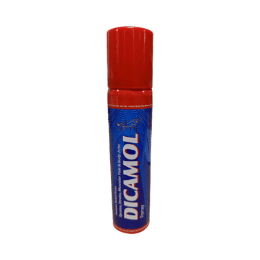 Dicamol Spray is a combination medicine used topically to relieve pain. It works by blocking the release of certain chemical messengers that cause pain and inflammation. It also improves blood circulation at the site of application and produces a cooling effect on the skin.Dicamol Spray is for external use only. Employ it in the exact dose and duration prescribed by your doctor. Do not use more than the prescribed amount, as it might increase the side effects. Check the label for directions before use. Immaculate and dry the affected area and apply the gel. Wash your hands thoroughly before and after applying the medicine, unless your hands are the affected area.