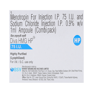 Diva Hmg HP 75IU Injection is given as an injection under the supervision of a doctor. Your doctor will decide the right time to take the injection, so always follow your doctor's advice. The dose and how often you take it depend on what you are taking it for. You might be prescribed certain other medicines as part of your treatment. You should take this medicine for as long as it is prescribed for you.