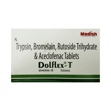 Dolflex-T Tablet is a pain relieving medicine. It is used to reduce pain and inflammation in conditions like rheumatoid arthritis, ankylosing spondylitis, and osteoarthritis. It may also be used to relieve fever, muscle pain, back pain, toothache, or pain in the ear and throat.Dolflex-T Tablet can be taken with or without food. This will prevent you from getting an upset stomach. You should take it regularly as advised by your doctor. Do not take more or use it for a longer duration than recommended by your doctor.