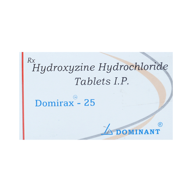 Domirax 25 Tablet belongs to a group of medicines called antihistamines, which means it is an anti-allergy medicine. It is used to treat various allergic skin conditions (e.g., eczema, dermatitis, allergies, rash). Domirax 25 Tablet effectively reduces symptoms such as swelling, itching, and redness associated with such conditions. It also helps relieve excessive anxiety or worry in people who are supposed to undergo surgery or have recently undergone surgery. It calms the brain and makes such people feel better.