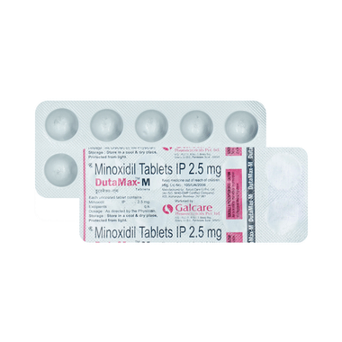 Dutamax M 2.5mg Tablet may be taken with or without food. Take it in the exact dose and duration as prescribed by your doctor. If used for hypertension, it may be used alongside other blood pressure medicines. It may take several months to see noticeable results, particularly for hair growth. Take it regularly and for as long as the doctor has prescribed for maximum benefits.