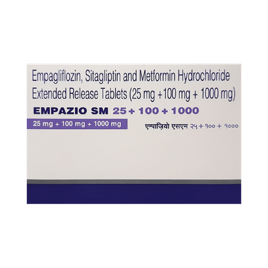 Empazio SM 25+100+1000 Tablet ER should be taken exactly as prescribed. It can be taken with or without food. Regular dosing is important to keep blood sugar under control. Do not skip doses or stop without medical advice, as this may cause uncontrolled diabetes. If a dose is missed, take it as soon as remembered, but do not double the dose.