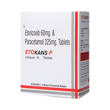 Etokans P Tablet is a pain-relieving medicine. It is used to reduce pain and inflammation in conditions like rheumatoid arthritis, ankylosing spondylitis, and osteoarthritis. It may also be used to relieve muscle pain, back pain, toothache, or pain in the ear and throat.