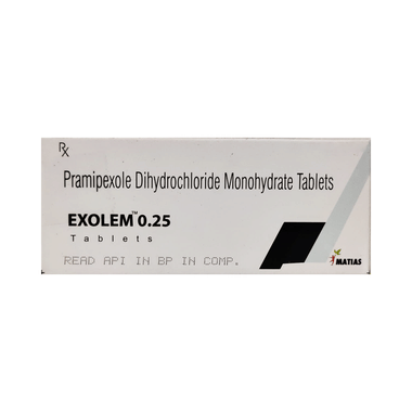 Exolem 0.25 Tablet is used in the treatment of Parkinson's disease and restless leg syndrome (an urge to move the legs usually accompanied or caused by uncomfortable and unpleasant leg sensations). It helps to treat excessive shaking by slowing down the body movements.