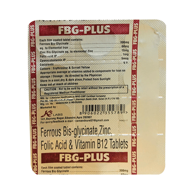 FBG-Plus Tablet is a combination of vitamins and mineral supplements prescribed to treat vitamin, folate, and other nutritional deficiencies. It ensures the proper growth and functioning of the body and strengthens immunity. It also treats and prevent different forms of anemia.