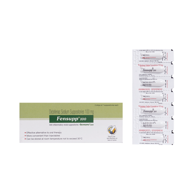 Fensupp 100 Suppository (7 Each) is a pain-relieving medicine. It is used to treat pain, swelling, stiffness, and joint pain in conditions like rheumatoid arthritis, osteoarthritis, and acute musculoskeletal injuries. It is commonly used in back pain, shoulder pain, neck pain, sprains, and spasms.