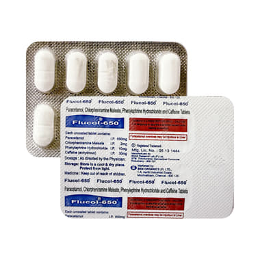 Flucol 650 Tablet is a combination of four medicines: Caffeine, Chlorpheniramine, Paracetamol and Phenylephrine. This combination is helpful in relieving the symptoms of cold. These symptoms may include body ache, headache, fatigue, fever, watery eyes, sneezing, cough, sore throat, and runny and stuffy nose.