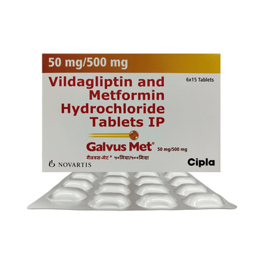 Galvus Met 50mg/500mg Tablet is a combination of two anti-diabetic drugs: metformin and vildagliptin. Metformin is an anti-diabetic medicine and belongs to the class of biguanides. It lowers the glucose production in the liver, delays glucose absorption from the intestines, and increases the body's sensitivity to insulin. Vildagliptin inhibits the enzyme DPP4 and increases the release of insulin from the pancreas. This combination is not advised for patients below 18 years of age.