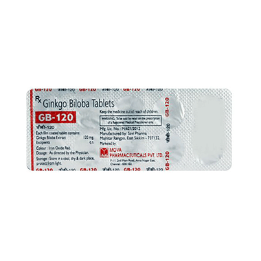 GB 120 mg Tablet is a herb collected from the dried green leaves of the plant called Ginkgo biloba. It has antioxidant, anti-inflammatory, and analgesic properties. It helps in managing a variety of diseases such as dementia, vertigo, and tinnitus (ringing in the ear).