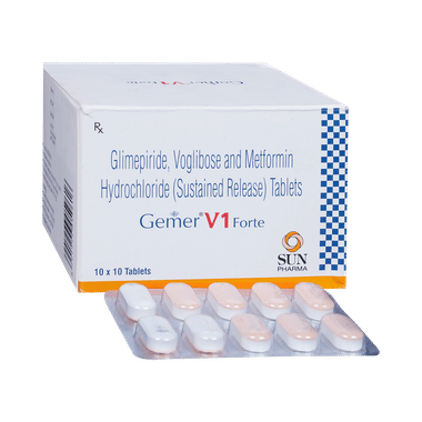 Gemer V 1 Forte /1000mg/0.2mg Tablet SR is a combination of medicines used in the treatment of type 2 diabetes mellitus (DM). It improves the blood glucose levels in adults when taken along with a proper diet and regular exercise. Glimepiride lowers the blood glucose levels by increasing the release of insulin from the pancreas. Metformin works by lowering glucose production in the liver and improving insulin sensitivity. Voglibose is an alpha-glucosidase inhibitor that lowers the postprandial (after meals) glucose levels in the body. This combination is not indicated for the treatment of type 1 DM.